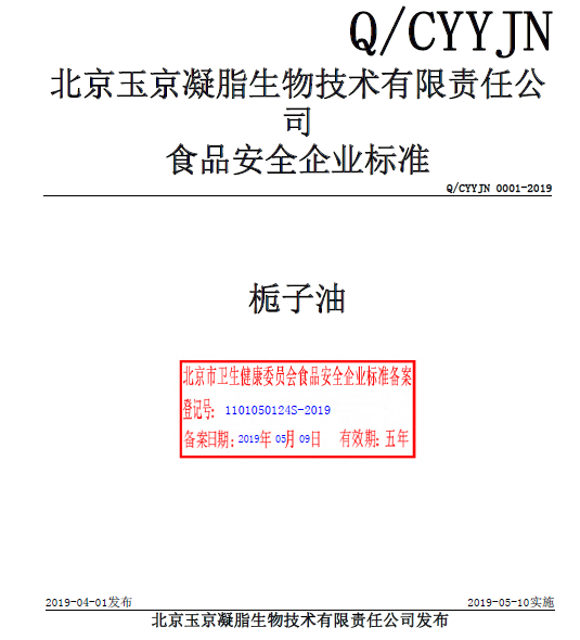 北京玉京凝脂生物技術(shù)有限責(zé)任公司本次備案的企業(yè)標(biāo)準(zhǔn)《梔子油》,經(jīng)過我公司技術(shù)人員朱麗真老師的編寫、備案,所提交的材料符合北京市衛(wèi)健委的備案要求,于2019年05月成功備案并在北京市食品安全標(biāo)準(zhǔn)管理系統(tǒng)公示。