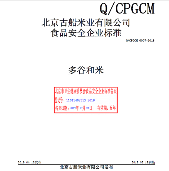 北京古船米業(yè)有限公司本次備案的企業(yè)標(biāo)準(zhǔn)《面米制品》,經(jīng)過我公司技術(shù)人員張炳福老師的編寫、備案,所提交的材料符合北京市衛(wèi)健委的備案要求,于2019年07月成功備案并在北京市食品安全標(biāo)準(zhǔn)管理系統(tǒng)公示。