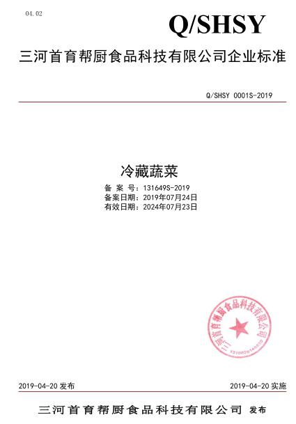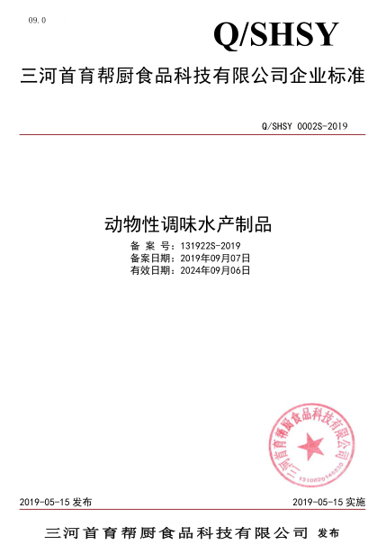 三河首育幫廚食品科技有限公司本次備案的企業(yè)標(biāo)準(zhǔn)《動(dòng)物性調(diào)味水產(chǎn)制品》、《冷藏蔬菜》,經(jīng)過(guò)我公司技術(shù)人員池建敏老師的編寫(xiě)、公示、備案,所提交的材料符合河北省衛(wèi)健委的備案要求,于2019年09月成功備案并在河北省衛(wèi)健委食品安全標(biāo)準(zhǔn)信息平臺(tái)公示。