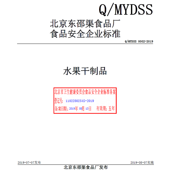 北京東邵渠食品廠本次備案的企業(yè)標(biāo)準(zhǔn)《水果干制品》,經(jīng)過我公司技術(shù)人員金玉成老師的編寫、備案,所提交的材料符合北京市衛(wèi)健委的備案要求,于2019年08月成功備案并在北京市食品安全標(biāo)準(zhǔn)管理系統(tǒng)公示。