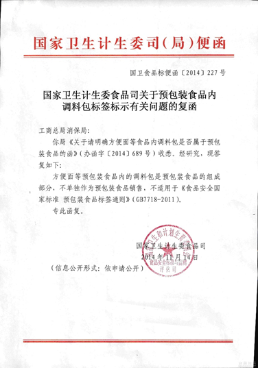 國家衛(wèi)生計生委食品司關于預包裝食品內(nèi)調(diào)料包標簽標示有關問題的復函(國衛(wèi)食品標編函[2014]227號)中規(guī)定:方便面等預包裝食品內(nèi)的調(diào)料包是預包裝食品的組成部分,不單獨作為預包裝食品銷售,不適用于《食品安全國家標準 預包裝食品標簽通則》(GB 7718-2011)。因此方便面等食品內(nèi)的調(diào)料包可以不按照GB 7718進行標識。