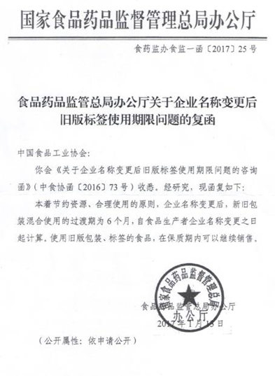 附:食品藥品監(jiān)管總局辦公廳關(guān)于企業(yè)名稱變更后舊版標(biāo)簽使用期限問題的復(fù)函