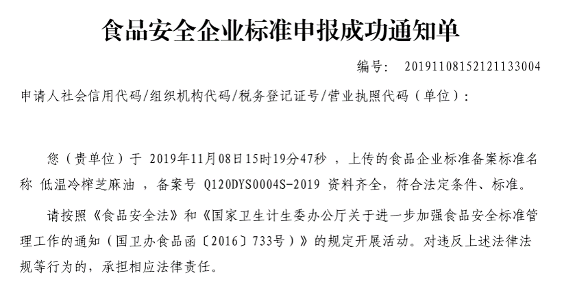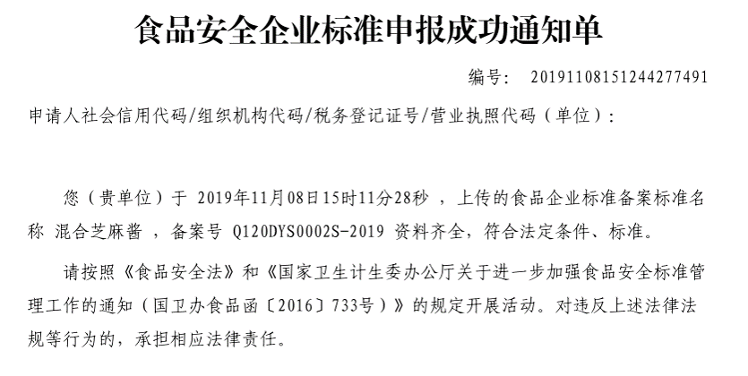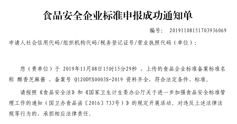 天津東宇順油脂股份有限公司本次備案的企業(yè)標(biāo)準(zhǔn)《低溫冷榨芝麻油》、《混合芝麻醬》、《醇香芝麻醬》,經(jīng)過(guò)我公司技術(shù)人員朱麗真老師的編寫(xiě)、備案,所提交的材料符合天津市衛(wèi)健委的備案要求,于2019年11月成功備案。