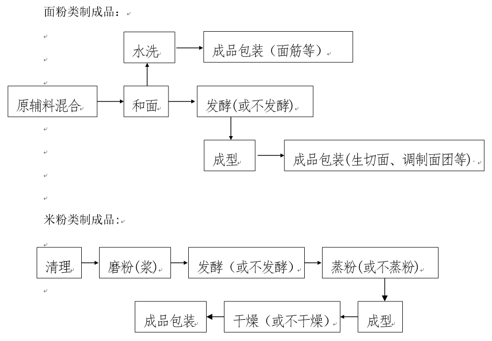 和面設(shè)備(面粉類制成品)、清理設(shè)施(米粉類制成品)、磨粉(漿)設(shè)備(米粉類制成品)、蒸粉設(shè)備(米粉類制成品中有蒸粉工藝的)、成型設(shè)備、包裝設(shè)備。